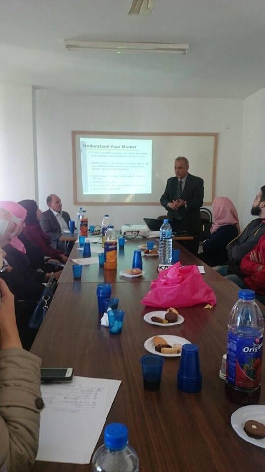 وقام د.نائل حطاب بالاستعانة بالبروفيسور جهاد ياسين محاضر في قسم الاقتصاد لتقديم هذه الورشة التي دارة محاورها حول كيفية تأسيس مشاريع تجارية صغيرة ومتوسطة، وحضر هذه الورشة مجموعة من افراد المجتمع.