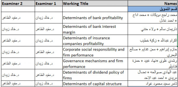 مناقشة مشاريع التخرج لقسم العلوم المالية والمصرفية في مواضيع مختلفة وهامة جدا في مجالات متعددة تتعلق بالبنوك وشركات التامين كما تناولت بعض الابحاث موضوع الحوكمة ومواضيع اخرى. حيث شارك عميد كلية الاقتصاد والعلوم الاجتماعية في مناقشة الطلبة بالاضافة الى لجنة المناقشة المكونة من رئيس قسم العلوم المالية والمصرفية د. خالد زيدان ود.اسلام عبد الجواد مدرس المساق و د.مفيد الظاهر.
