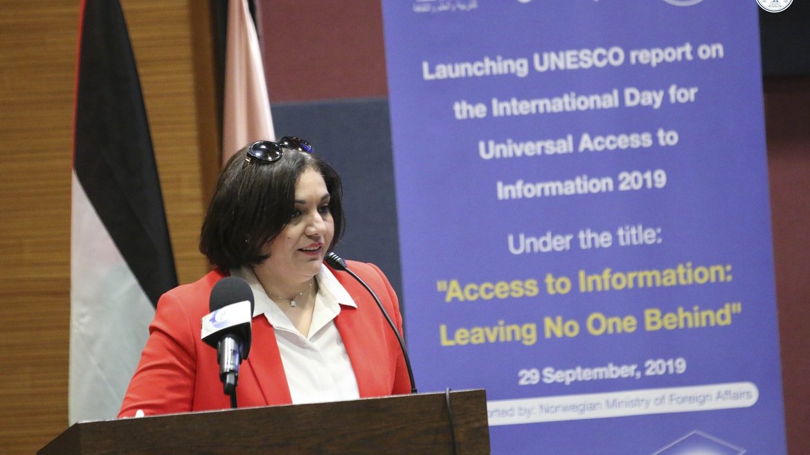 من ناحيتها، قدمت الأستاذة هلا طنوس، مساعد مكتب اليونسكو في فلسطين ومنسقة برنامج الإتصال والإعلام، ورقة وملخصا حول تقرير حق الحصول على المعلومات تمحورت حول الاتجاهات الرئيسية وهي الإعتراف بأهمية الوصول إلى المعلومات في أجندة التنمية المستدامة والاهتمام المتزايد في توفير ضمانات قانونية للوصول للمعلومات وتحسين عملية تنفيذ تلك القوانين، والتحديات الرقمية الجديدة والفرص المتوفرة بالأفق.