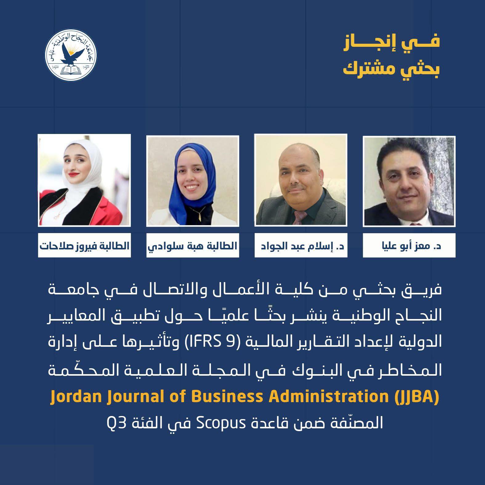 فريق بحثي من كلية الأعمال والاتصال في جامعة النجاح الوطنية ينشر بحثًا علميًا حول تطبيق المعايير الدولية لإعداد التقارير المالية (IFRS 9) وتأثيرها على إدارة المخاطر في البنوك، وذلك في المجلة العلمية المحكّمة (JJBA) المصنفة ضمن قاعدة Scopus في الفئة Q3