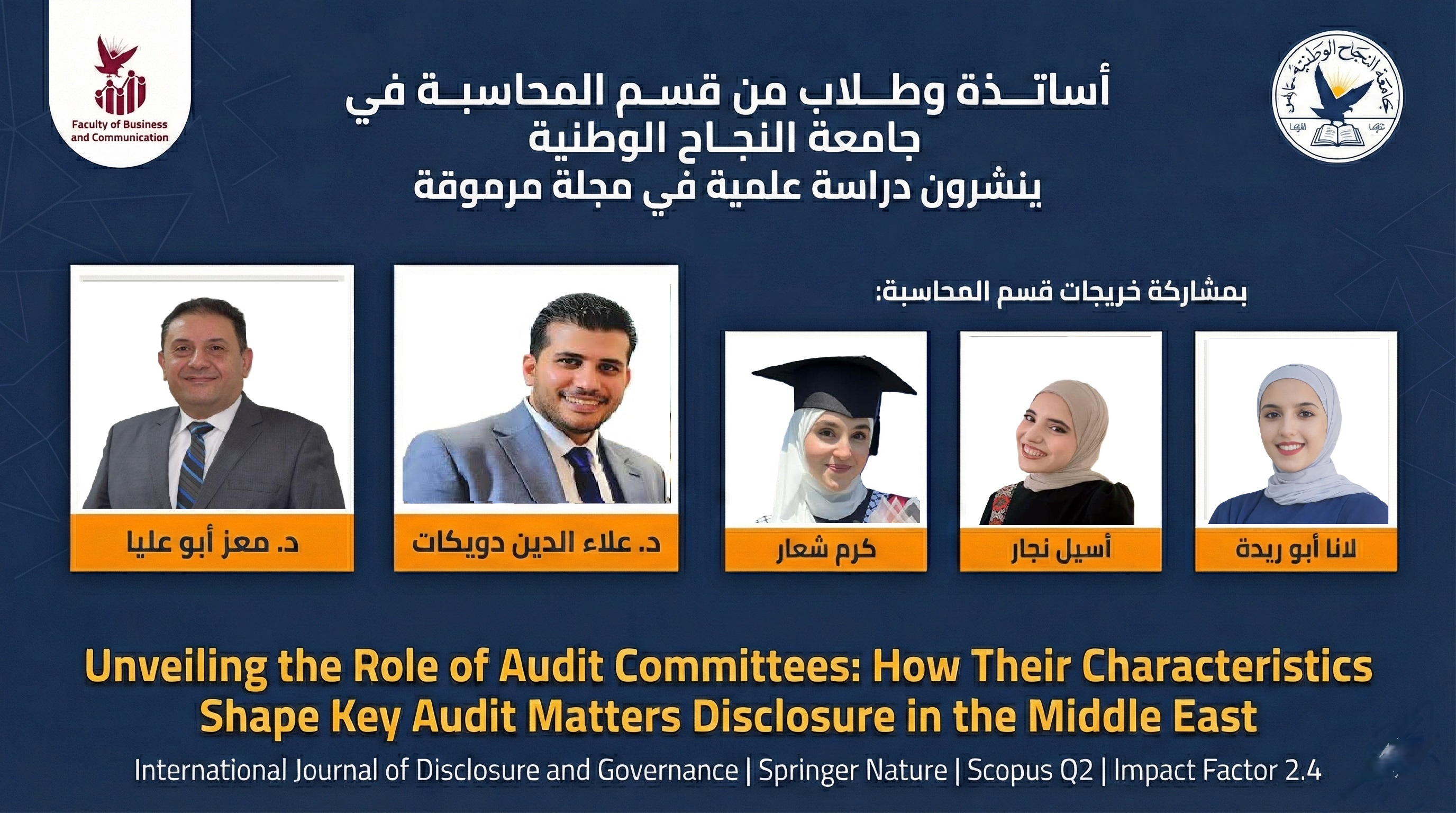 أساتذة وطلاب من قسم المحاسبة في جامعة النجاح الوطنية ينشرون دراسة علمية في مجلة مرموقة