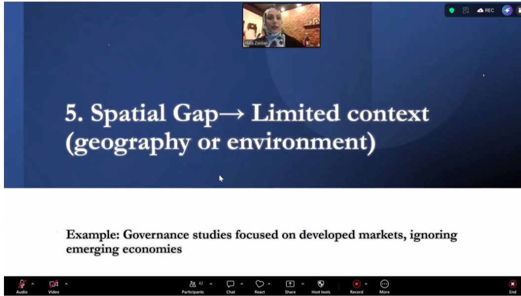 وفي ختام الورشة، تتقدم كلية الأعمال والاتصال بجزيل الشكر والتقدير للدكتورة حلا زيدان على عطائها العلمي المتميز، ومساهمتها القيّمة في نقل خبراتها البحثية للمشاركين، كما تعبّر الكلية عن اعتزازها بمشاركة الحضور الكريم الذي أسهم في إنجاح هذه الفعالية العلمية.