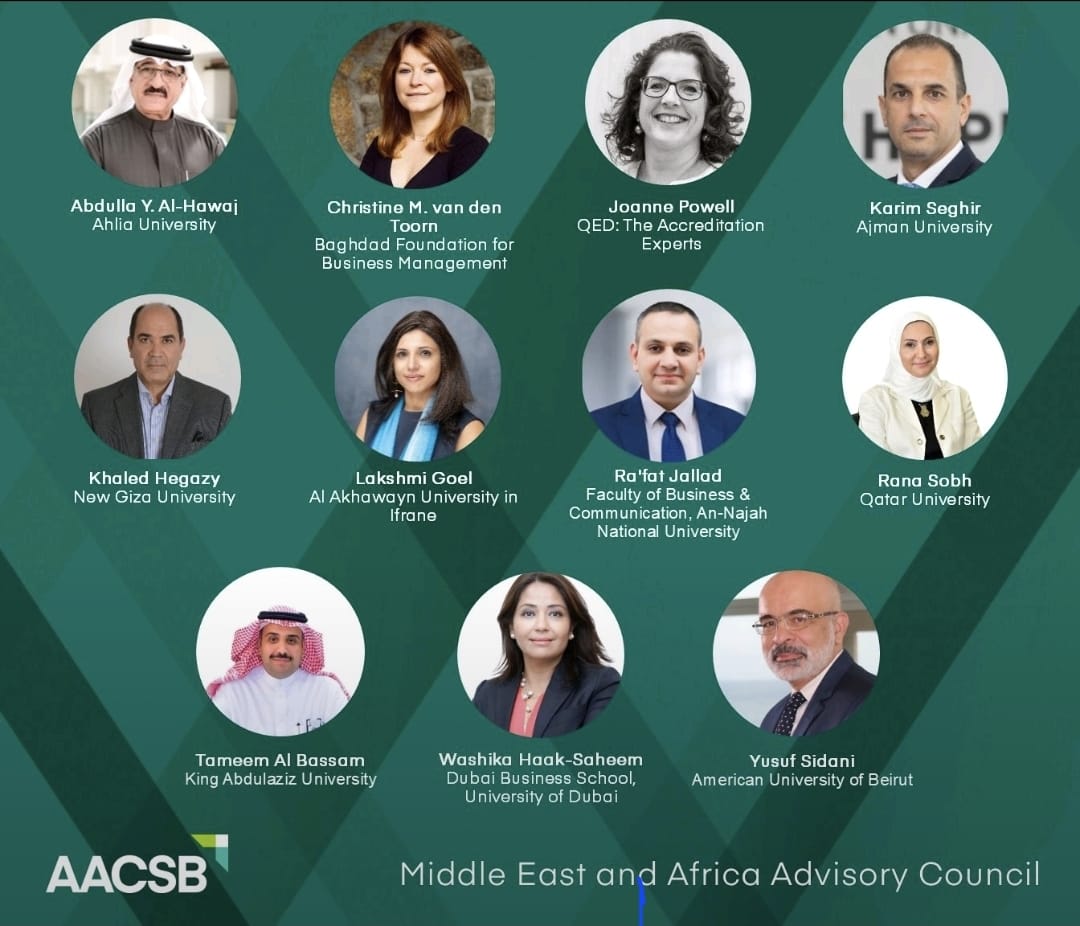 The Faculty of Business and Communication at An-Najah National University extends its sincere pride and congratulations to Dr. Ra’fat Al-Jallad, Dean of the Faculty, on the occasion of his selection as a member of the Middle East and Africa Advisory Council of AACSB International, the world’s leading accreditation body for business schools.